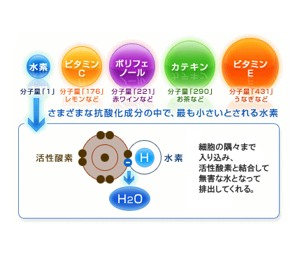 誰もが知っている水素の特徴は、活性酸素を還元する抗酸化能力の高さです。 一般的にビタミンCなどの「抗酸化食品」を摂る事で、活性酸素を減らせる事は有名ですが、それらの食品は全ての活性酸素と反応するので、体に必要な善玉活性酸素まで減少させてしまうのです。 更にそれらの食品は、消化吸収した後に老廃物も発生して老廃物がまた酸化してしまいます。そして、活性酸素には、「善玉活性酸素」と「悪玉活性酸素」の2種類がありますが、「悪玉活性酸素」のみを水に変えて流す働きがあるとされています。